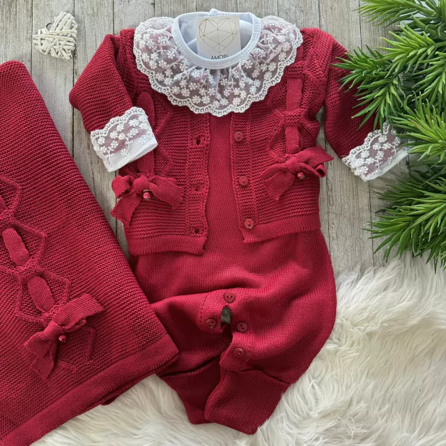 Saída Maternidade Menina de Tricô Vermelha com Casaquinho